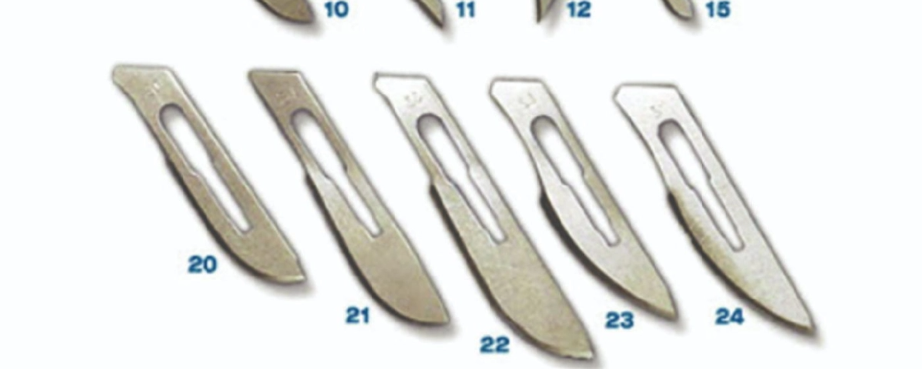 Surgical blades made of stainless steel, sharp and precise, used for various surgical procedures depending on blade number.
