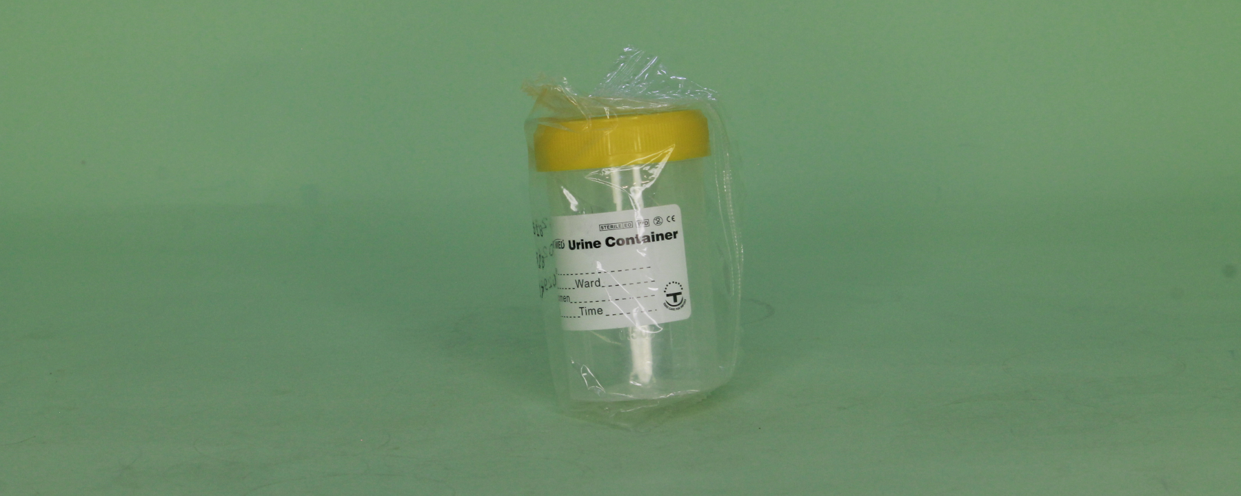 Container designed for urine sample collection. Made of medical-grade plastic with a screw cap to prevent leakage. Comes with printed graduations and a label for patient information. Ideal for hospitals and laboratories