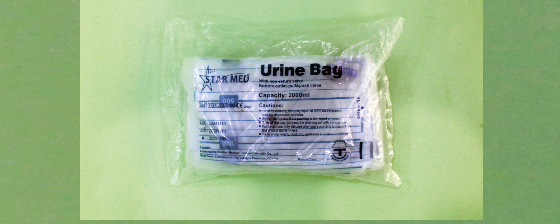 Urine drainage bag with 2000ml capacity, made of transparent material for easy monitoring. Equipped with a pull & push valve for controlled emptying, and comes with a long, flexible tube. Sterile and single-use, suitable for hospital or home care patients