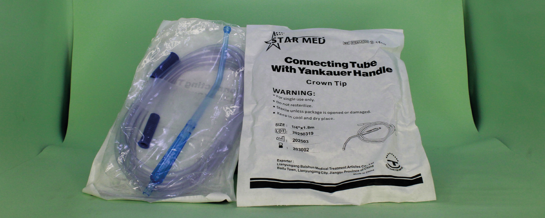 المنتج **Connecting tube with Yankauer** هو أنبوب طبي مرن يستخدم لشفط السوائل والمخاط من الفم أو الحلق. يتصل بأنبوب شفط (Yankauer) الذي يحتوي على رأس لشفط السوائل بسهولة أثناء العمليات الجراحية أو العلاجية.