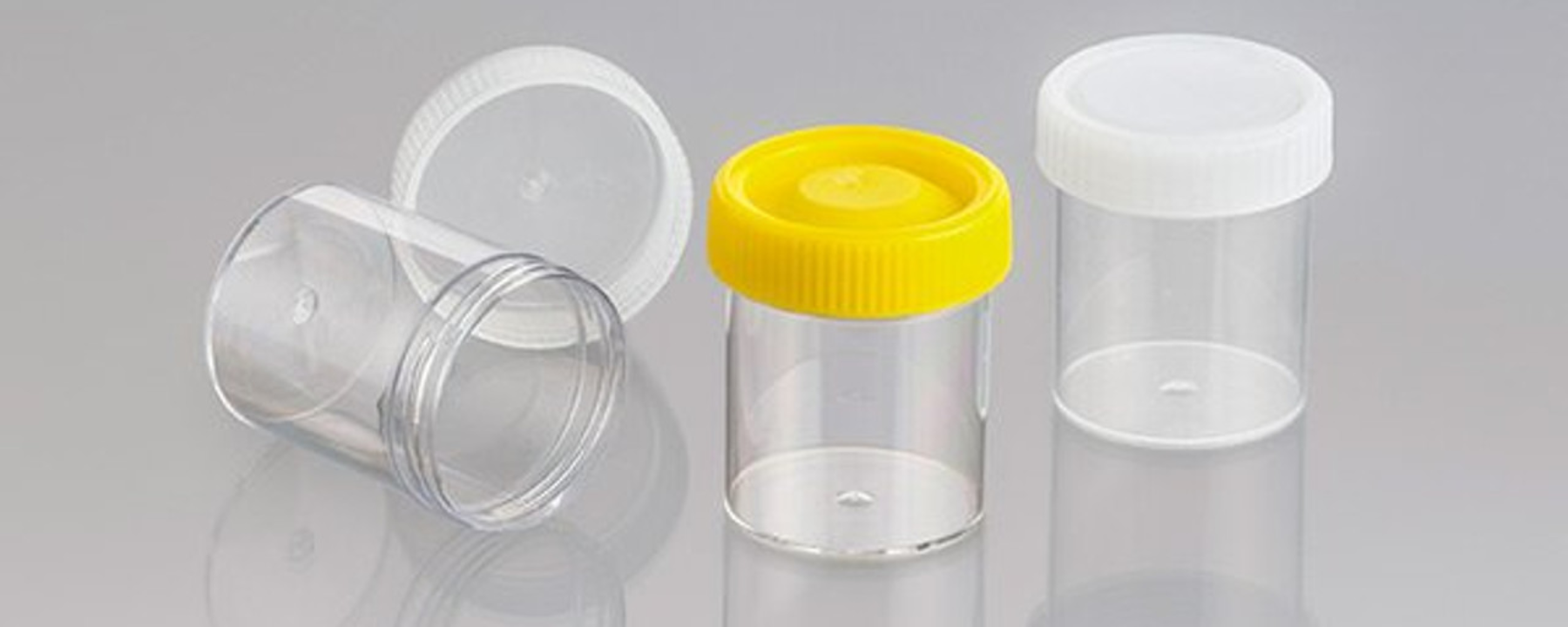 علبة مخصصة لجمع عينات البول، مصنوعة من البلاستيك الطبي، تحتوي على غطاء لولبي يمنع التسرب، مع تدرجات لقياس السائل وملصق لتدوين بيانات المريض. مثالية للاستخدام في المستشفيات والمختبرات.