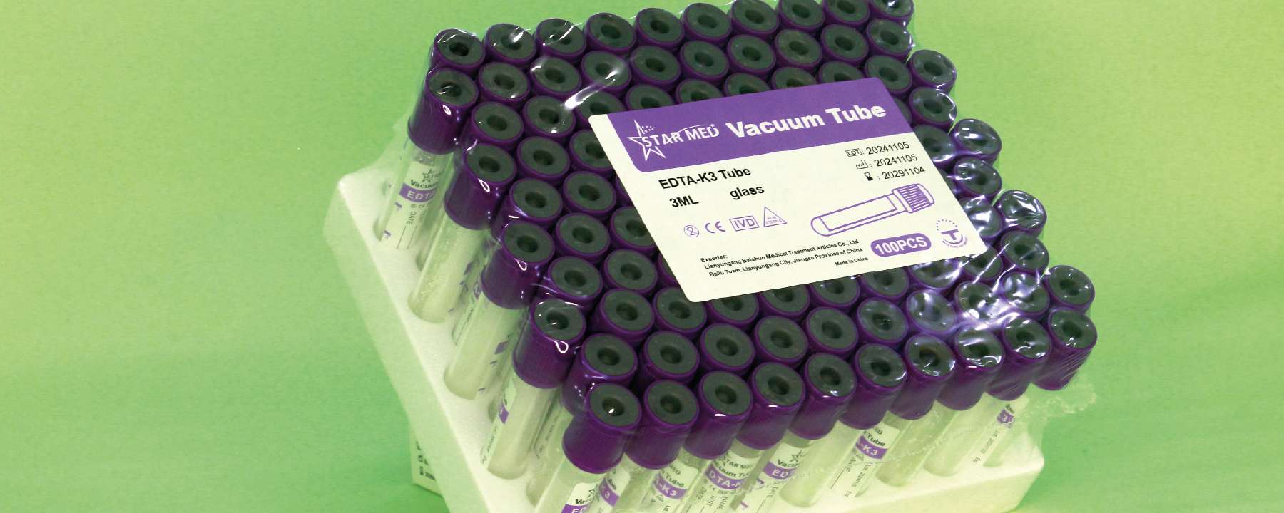 Glass vacuum tube for blood sample collection, pre-filled with EDTA K3 anticoagulant. Used for routine hematology tests such as CBC and differential counts. Non-sterile and designed for clinical laboratory