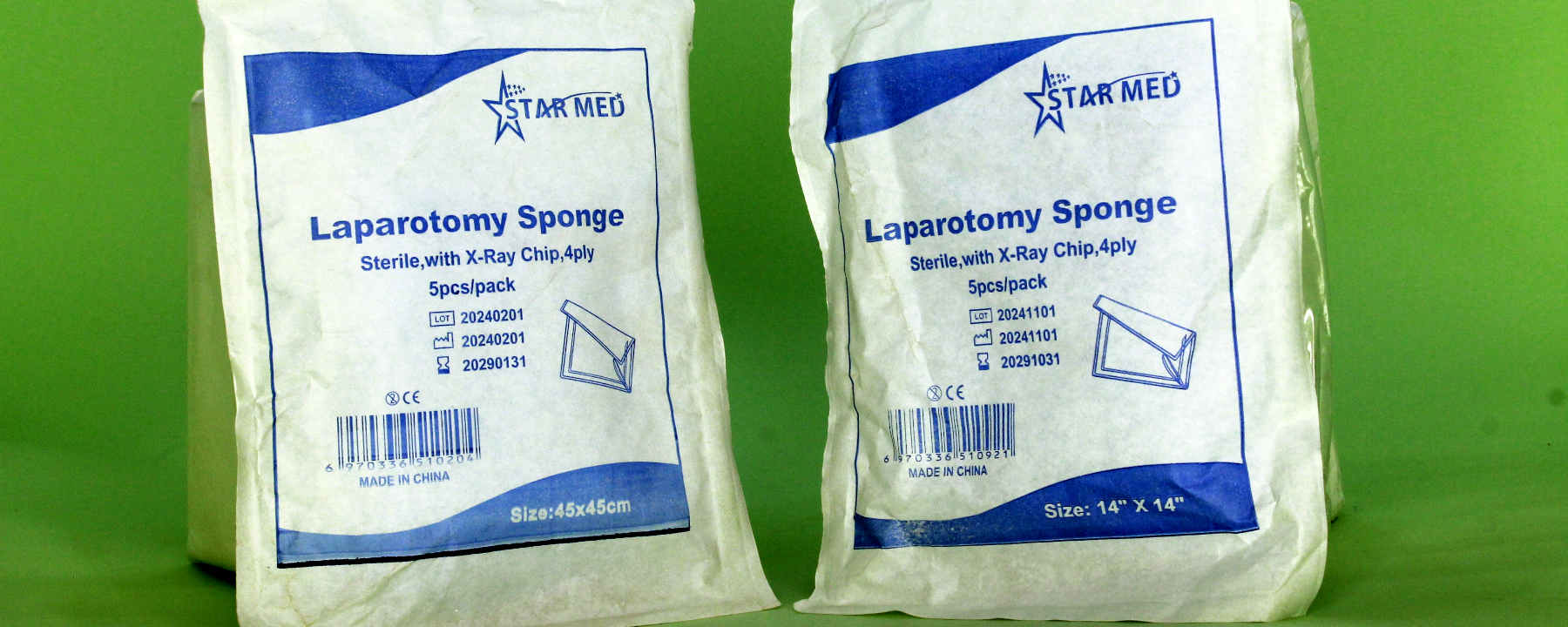 It is a medical sponge used during surgical operations in the abdominal cavity (laparotomy). This sponge is highly absorbent and comes in a special bag that makes it easy to spot and track during medical procedures. They are used to clean and absorb fluids from the surgical area, helping to keep the surgical field clean and organized.